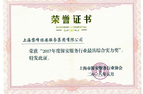 2017年 被上海市公安局評(píng)為2016年度保安服務(wù)行業(yè)業(yè)務(wù)發(fā)展優(yōu)勝獎(jiǎng)